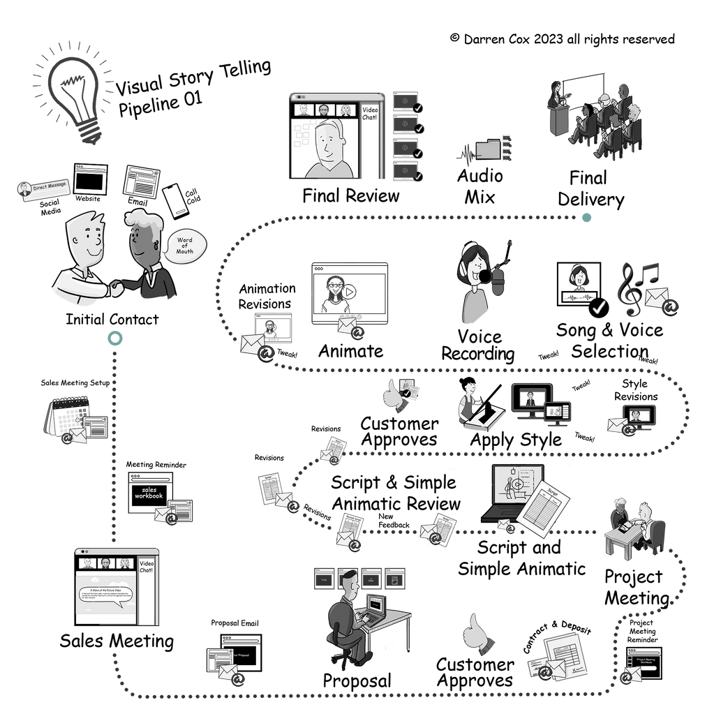 I communicate clearly with the people I work with by making my process open and easy to understand. To do this, I illustrate and use a communication tool called a Customer Journey Map, which helps me outline the different stages of production for the client. For instance this example, I use specifically for a kind of video that innovation teams use to explain their ideas.